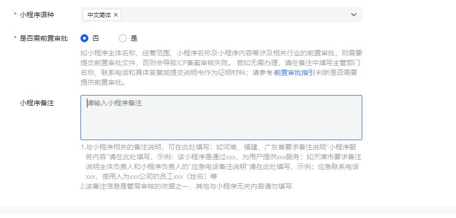 提交备案时【是否需前置审批】选择【否】,小程序备注,可以填写:小程序主要内容为公司简介及产品信息展示、联系方式等。