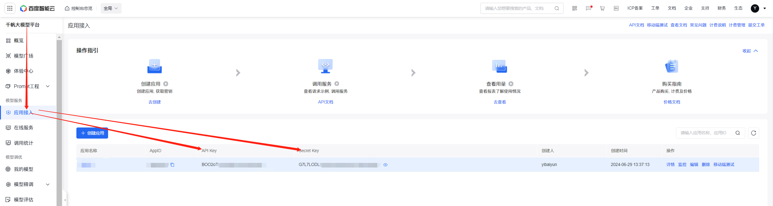 七、在应用接入可直接看到,API Key和Secret Key信息。复制信息粘贴到轻站6.0后台,百度Al助手配置页面的【基础设置】中,已经配置完毕